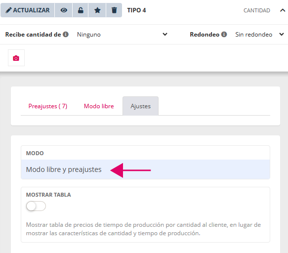 Desde la pestaña de la interfaz de la característica en el gestor se puede seleccionar este modo. Permite presentar en el producto las opciones de cantidad en modo libre y en modo opciones de cantidad a seleccionar.