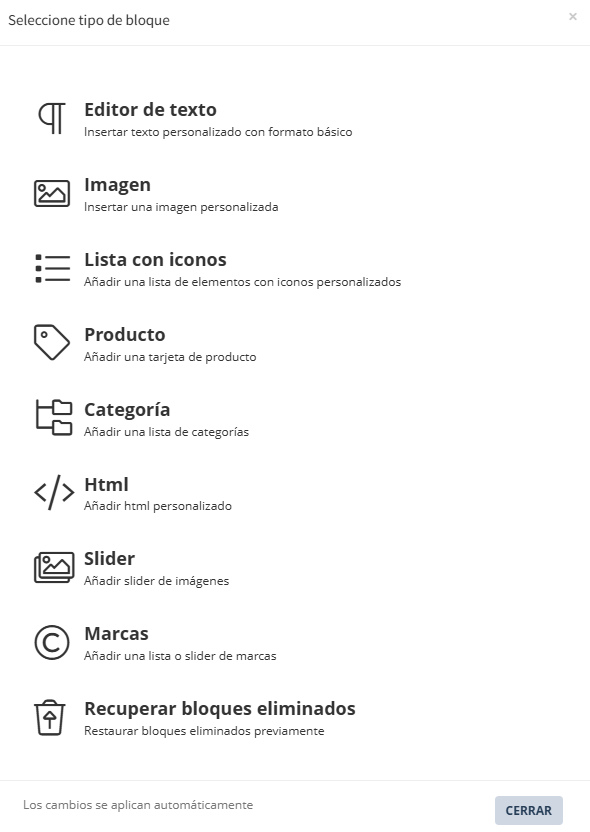 Los bloques eliminados se quedan guardados para poder ser reutilizados en la sección "Recuperar bloques eliminados". Consultar la página correspondiente de esté capítulo del manual para conocer más detalles.