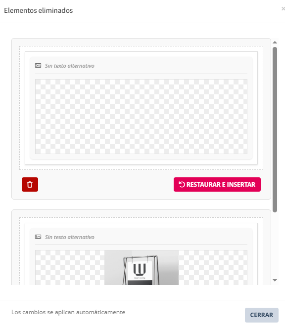 | Tarjeta / Contenedor del elemento eliminado | Zona en donde se presentan los bloques eliminados. Disponibles para recuperar. Incluye una vista previa del contenido. |