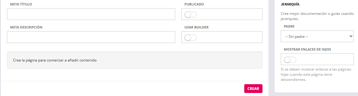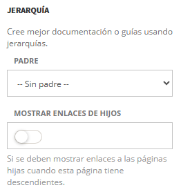 Con esta interfaz se pueden anidar las páginas como hijas de otras. En la vista pública se mostrará en la página enlace a las páginas hijas y descendientes.