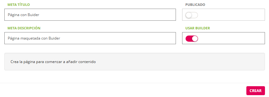 Botón para guardar los cambios. Crea la página y accede al editor de la página con Builder. |