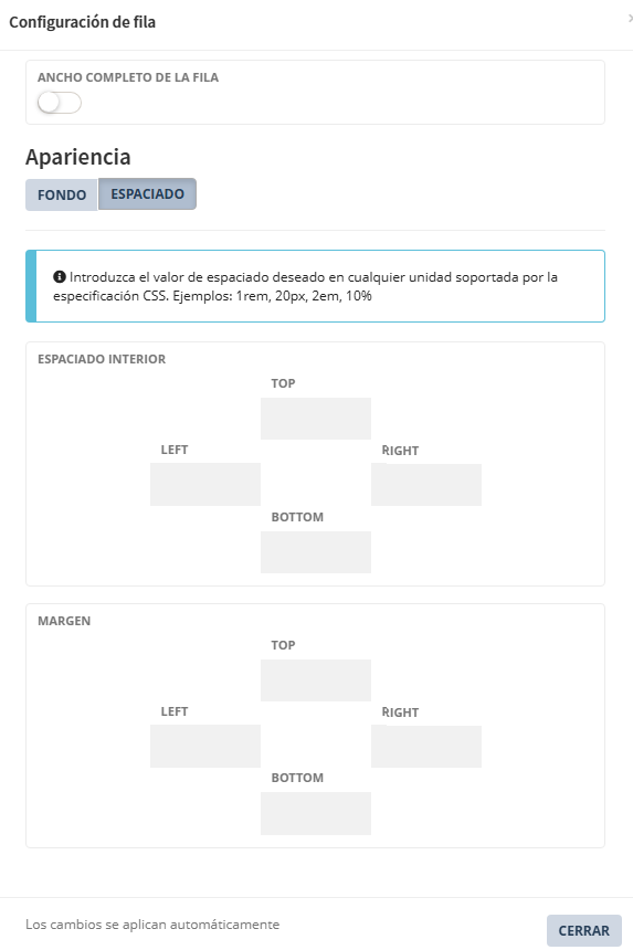 Permite activar o desactivar el ancho completo (full width) para la fila. Desactivado, en color blanco: la fila mantiene el ancho definido por el contenedor o estructura de la página (ancho estándar). Activado, en color magenta: la fila en la vista pública se expande para ocupar todo el ancho disponible de la pantalla. La interfaz presenta un nuevo botón llamado, CONTENIDO DE ANCHO COMPLETO DE LA FILA. |