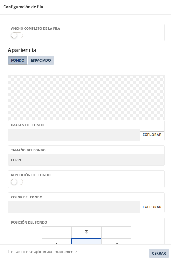 Para presentar una como fondo de la fila. Hacer clic en botón "Explorar" para cargar la imagen. También dispone de campo de consulta y edición de la url de la imagen. |