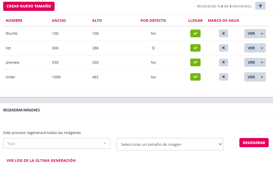 Todas las imágenes subidas a la aplicación son redimensionadas según los tamaños aquí establecidos. Desde el panel se pueden crear nuevos tamaños y modificar los existentes.
