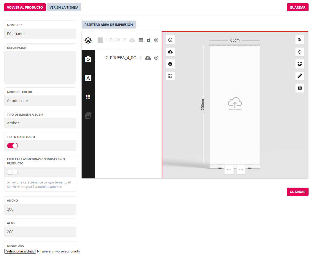 Permite limitar la personalización según el tipo de imagen a subir. Disponibles cuatro opciones, ninguno, vector (SVG) , trama (mapa de bits JPG o PNG) o ambos (trama y vector). |