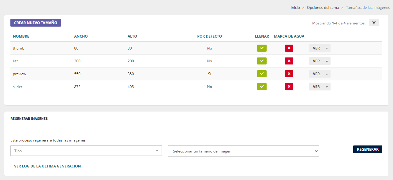 ¡Atención! No modificar de los nombres de los tamaños creados por defecto, ya que pueden ocasionar pérdida de funcionalidades básicas.