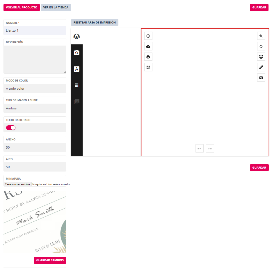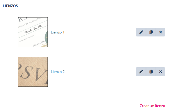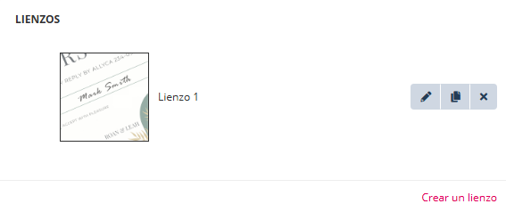 En el supuesto de tener más lienzos creados en un producto, por cada uno se mostrará su imagen miniatura, y su nombre.