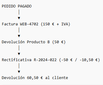 Si un pedido ya pagado y facturado se cancela parcialmente (por ejemplo, se devuelve uno de los productos), la factura original no puede modificarse ni eliminarse.