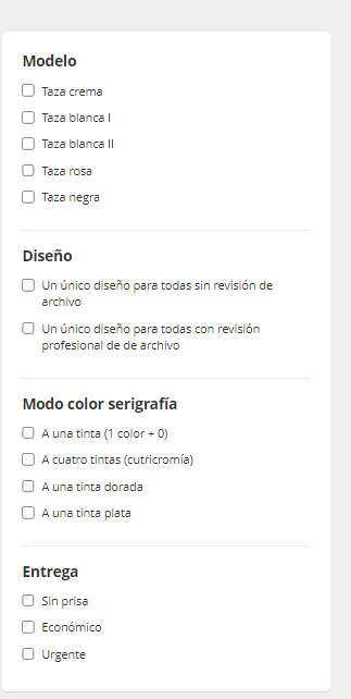 Al generar una combinación muestra en modo árbol las características y los valores. Marcando las casillas de cada valor de característica creamos la combinación.