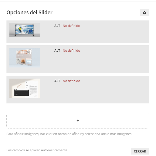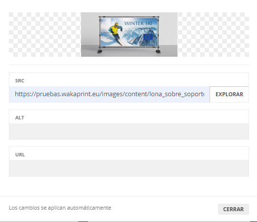 Permite presentar una imagen, con campo para etiqueta alt, y campo para especificar url del enlace (opcional).