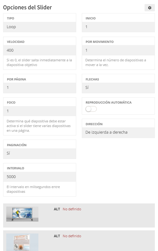 Dispone de una interfaz de ajustes de opciones de modos de comportamiento del carrusel, velocidad de transición de diapositivas, dirección, e intervalo entre otros.