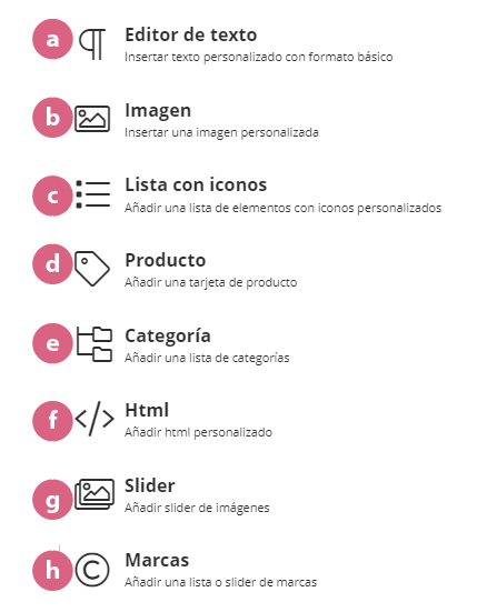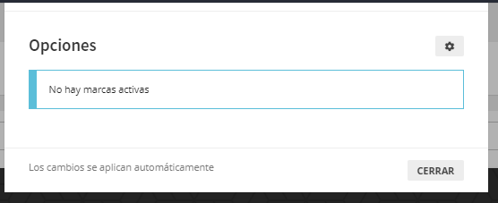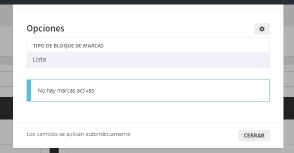 Permite mostrar marcas en modo lista o slider. Permite añadir una marca de las creadas en la sección de Marcas de la aplicación.