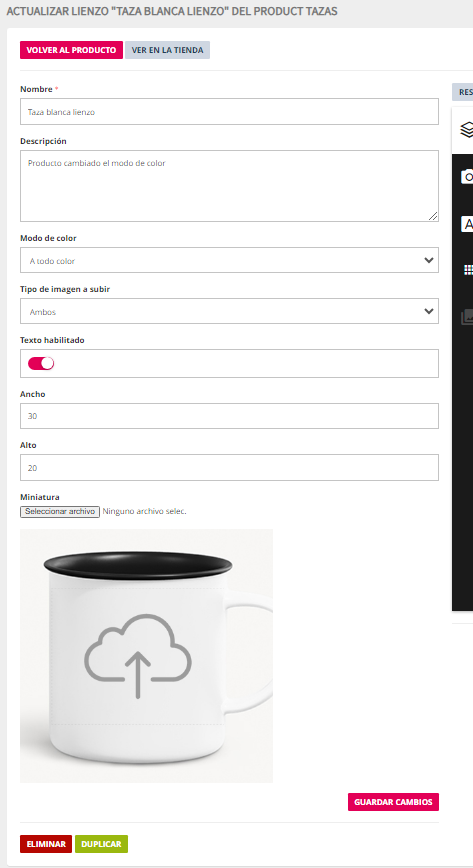 - Se muestra la interfaz de crear lienzos en la columna izquierda de le ficha de producto.