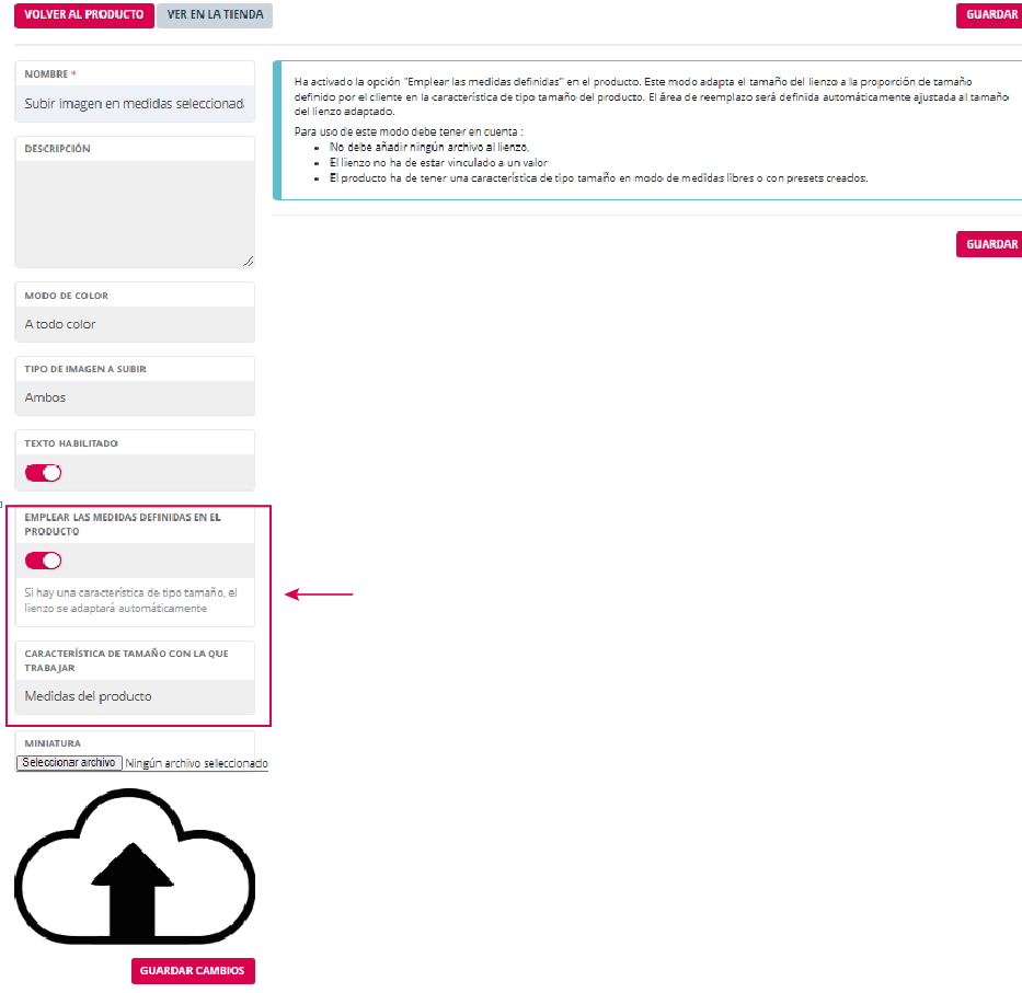 - Activar el botón "Emplear las medidas definidas en el producto" y seleccionar la característica de tipo medidas por el nombre que se le ha dado.