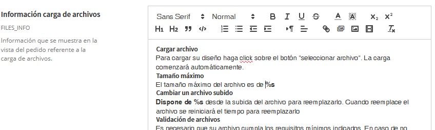 En el seguimiento del pedido, debajo del botón llamado "elegir archivo" para subida de archivo del producto se muestra un botón llamado, "Limitaciones e instrucciones de carga". Este botón lleva al contenido del editor de texto que está en Ajustes->Ajustes Generales->General->Información carga de archivos.