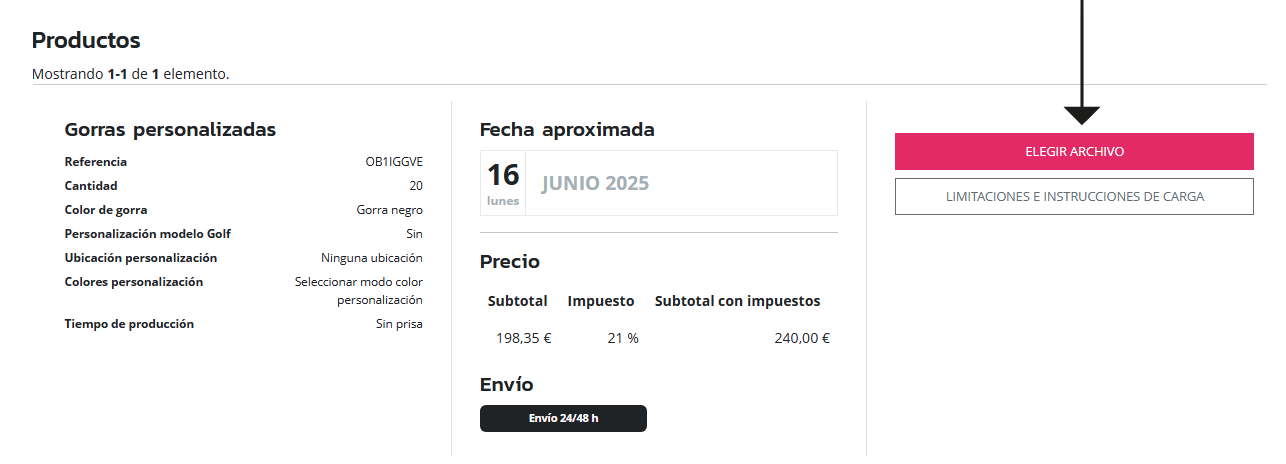 - En el seguimiento del pedido tramitado, al cliente se le presenta un botón de subida de archivo en cada producto de su pedido.